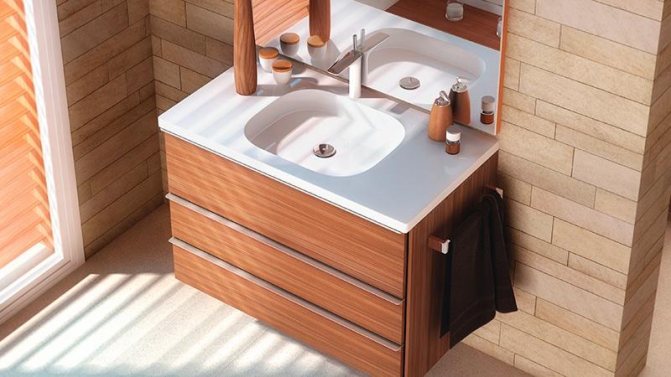 Les structures intégrées sont une symbiose entre un évier et une table de chevet. Du point de vue esthétique, cette option est très avantageuse: toutes les communications sont cachées, il n'est pas nécessaire de clôturer les boîtes. Mais le "moidodyr" prend beaucoup de place, et la hauteur de l'évier lui-même est déterminée par la taille de l'armoire et n'a pas de plage "plus ou moins".