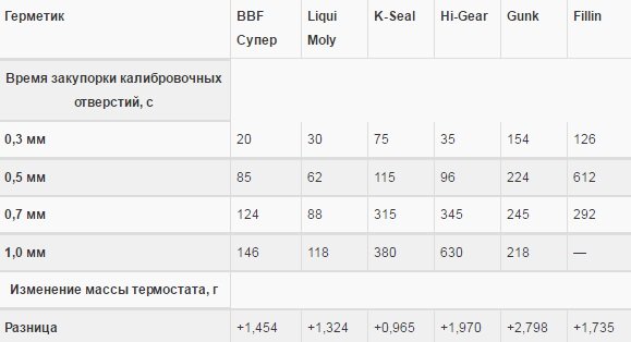 Pour faciliter la sélection, un tableau récapitulatif avec deux caractéristiques aidera: le temps de colmatage des trous de différents diamètres et le niveau des dépôts. Pour évaluer ce dernier paramètre, le poids du thermostat a été utilisé avant et après l'application de l'additif. Ces essais de produits d'étanchéité ont été effectués au Département des moteurs à combustion interne de l'Université polytechnique de Saint-Pétersbourg.