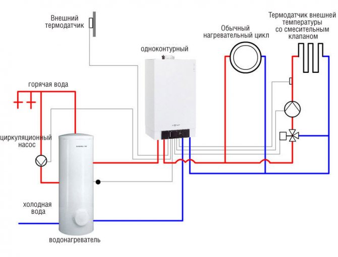 | Chaudière à chauffage indirect. Il peut être connecté à n'importe quelle source de chaleur (en particulier, une chaudière à un seul circuit ou un chauffage central) et utiliser l'énergie du caloporteur pour chauffer l'eau. |