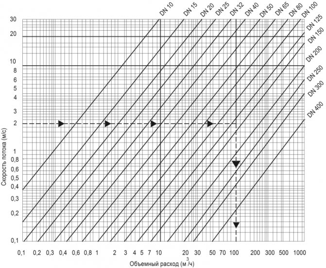 - Il est possible d'augmenter la charge thermique sur le circuit sans augmenter le diamètre du remplissage, en augmentant le débit (lire - les performances de la pompe de circulation). Cependant, il est préférable de maintenir la vitesse d'écoulement dans la plage de 0,4 à 0,6 m / s: on évitera alors l'érosion des tuyaux en plastique par les suspensions et l'apparition de bruit hydraulique sur les raccords et les étranglements.
