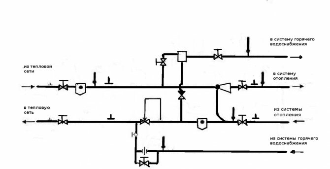 | Unité d'ascenseur avec alimentation en eau chaude. L'élévateur à jet d'eau assure une vitesse de déplacement élevée du caloporteur (mélange d'eau d'alimentation et de retour) et, par conséquent, une différence de température minimale entre le début et la fin du circuit de chauffage. Deux ou quatre raccordements fournissent une alimentation en eau chaude sans issue ou à circulation. |