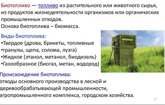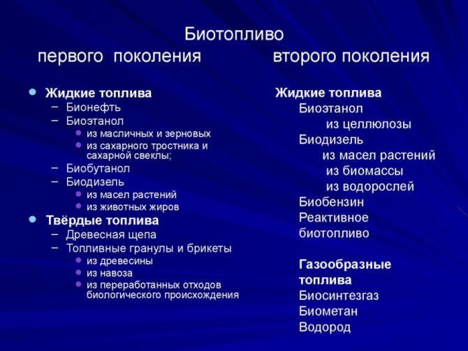 Le premier type de carburant est fabriqué à partir d'huiles végétales. Le biogaz est une sorte de remplacement du gaz conventionnelgénérés lors du traitement des déchets et des ordures ménagères. Le biodiesel contient également de l'éthanol et peut facilement remplacer l'essence ordinaire.