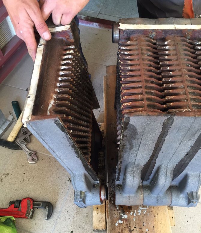 Suie et rouille à l'intérieur des sections de l'échangeur de chaleur en fonte. - Nettoyage du brûleur, de la chambre de combustion et des parois extérieures de l'échangeur de chaleur... Pendant le fonctionnement, de la suie se forme sur ces éléments, les débris et la poussière de la pièce sont retenus, une couche d'au moins 0,5 cm réduit l'efficacité de plus de 10%. Le processus de nettoyage ne diffère pas non plus des analogues, à l'exception d'une conception de brûleur différente (nous l'avons également décrit plus tôt).