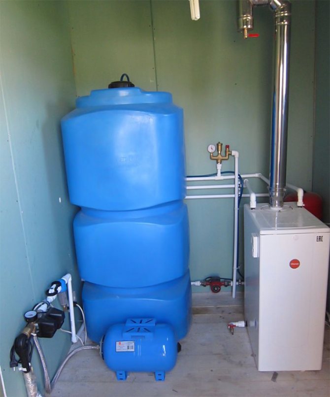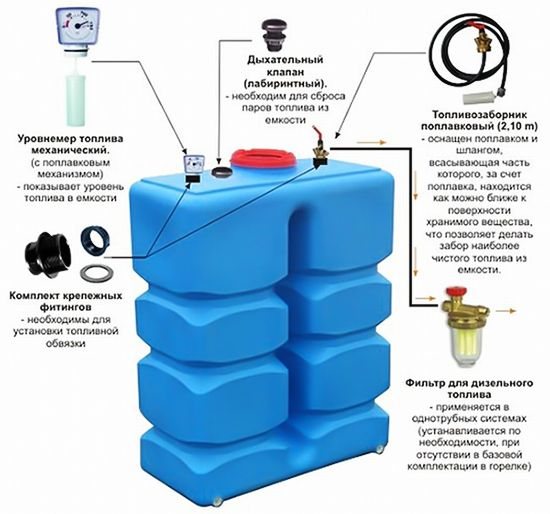 Il existe des restrictions de sécurité incendie pour l'installation d'un réservoir de carburant dans le bâtiment de la chaufferie - pas plus de 0,8 m3. En règle générale, les chaudières diesel sont équipées de conteneurs en polymère résistant aux environnements agressifs. Selon le schéma de raccordement, ils sont installés à l'extérieur.