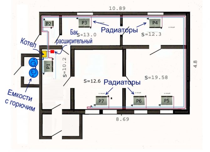 Nous avons effectué les calculs de base. Vous devez maintenant estimer l'emplacement de la chaufferie, des radiateurs, des réservoirs de carburant sur le plan de la maison et, à partir de là, calculer le besoin de tuyaux pour la distribution du chauffage et les accessoires nécessaires.