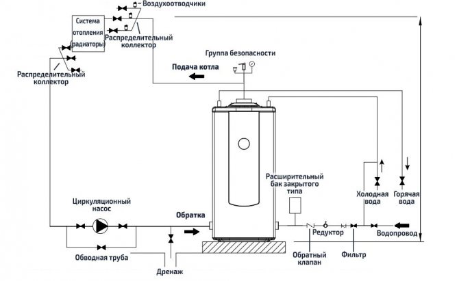 La tuyauterie de la chaudière ne diffère pas non plus de celle utilisée pour l'installation d'analogues, un exemple de schéma de connexion classique à un système de type fermé est illustré sur la photo ci-dessous.