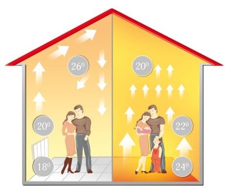 Un exemple frappant est un appartement. Il y a le chauffage central, et en cas de fortes gelées ou pour plus de confort, nous fabriquons et allumons des planchers chauffants à des fins locales (bain, cuisine, crèche).