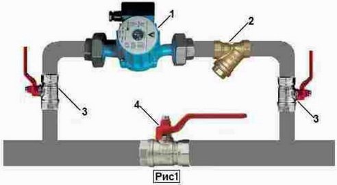Si la pompe est retirée, un exemple typique d'installation d'un filtre devant la pompe est illustré sur le schéma ; des robinets sont également nécessaires pour l'entretien du filtre, dont la régulation est de 1 an.
