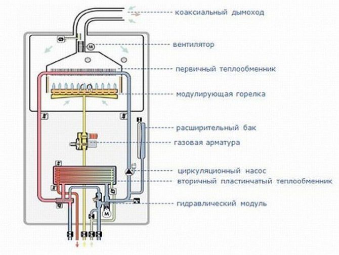 - Brûleur à gaz... Il fournit du gaz à la chambre où se déroule le processus de combustion. Les injecteurs distribuent le carburant aussi uniformément que possible. Les brûleurs modulants modernes peuvent maintenir une température définie et réguler la force de la flamme.