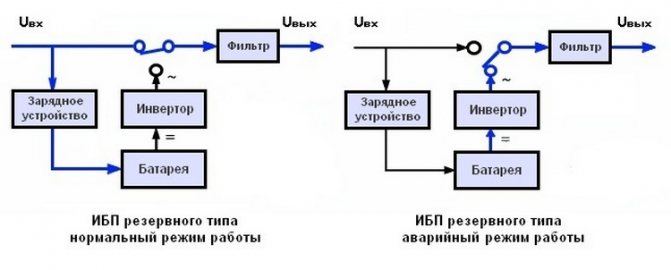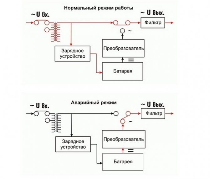 En cas de coupure de courant, les paramètres dépassant les valeurs de la plage le commutateur connecte la batterie standard en 4 à 12 ms. La tension constante de la batterie est d'abord fournie au convertisseur électrique, où elle devient variable, puis augmente au niveau requis. 220 V.
