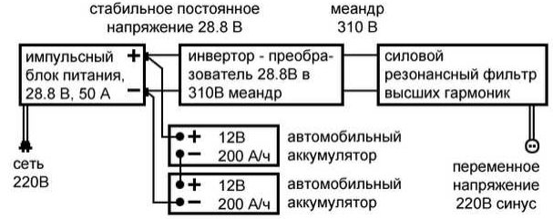 - La sortie de l'onduleur est connectée au filtre, à la sortie de laquelle on obtient la tension 220 V 50 Hz avec sinus "pur".