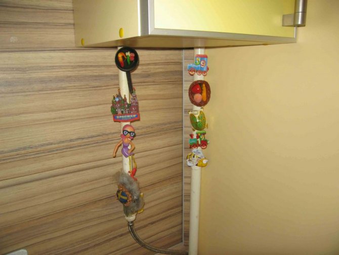 Une grande trousse à crayons convient pour masquer la colonne montante. Avant de l'installer, la paroi arrière de la structure est retirée et des évidements sont réalisés sur les étagères intérieures (dans la partie où elles jouxtent le mur), en répétant la taille et la forme du tuyau.