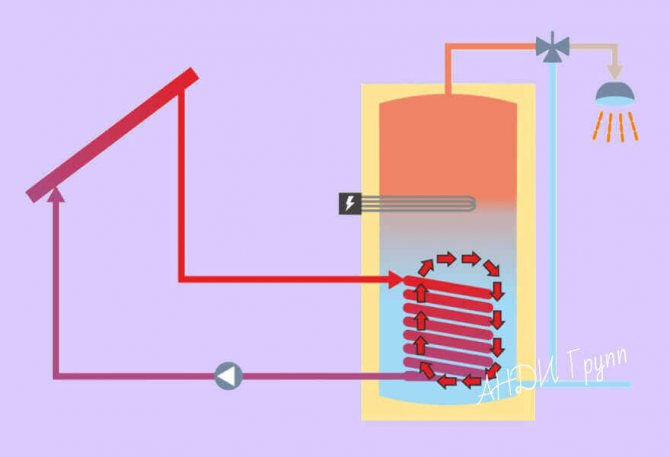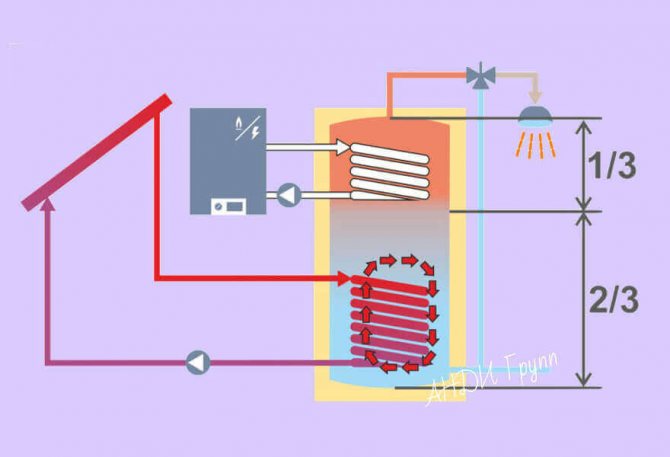 L'eau chaude pénètre dans le réservoir de stockage à travers lui. En refroidissant dans le processus, il descend à l'emplacement de la pompe circulaire et avec son aide est renvoyé dans le passage principal afin de revenir à la chaudière pour le chauffage suivant.