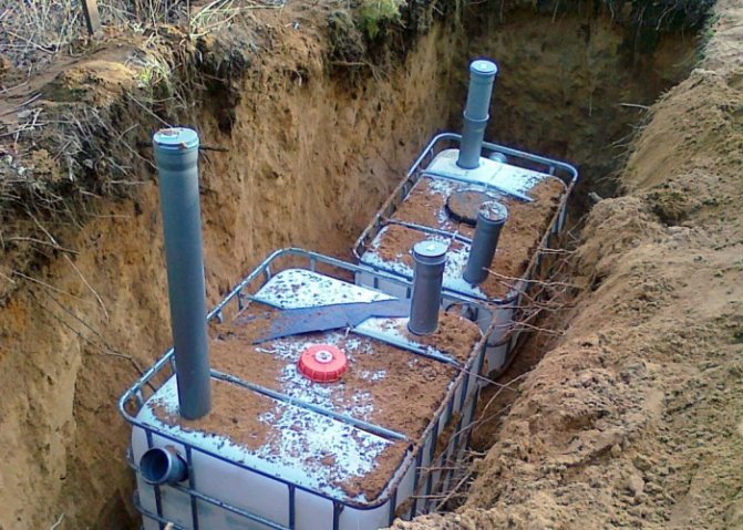 La première étape consiste à préparer une fosse (tranchée) pour les Eurocubes. Séparation de la fosse de la profondeur requise afin que les cubes soient situés en dessous du niveau de congélation du sol (pas plus de 3 m au bas du premier cube, en tenant compte de la longueur des tuyaux des autosilos domestiques), arrangez un coussin de sable et de gravier. La sévérité des Eurocubes remplis de drains est tout à fait capable de pousser à travers un sol mou (les tuyaux de raccordement vont alors complètement éclater), donc une chape en béton (ciment-sable) sur le dessus de l'oreiller sera utile.Le deuxième cube-chambre d'une fosse septique est toujours installé 20-30 cm plus bas que le premier (si les cubes sont de la même taille). Par conséquent, au fond de la fosse, la surface du coussin / chape sous le deuxième eurocube est respectivement décalée vers le bas. Si vous prenez un deuxième cube d'une capacité de 800 litres (hauteur proportionnellement inférieure), cela ne sera pas nécessaire.