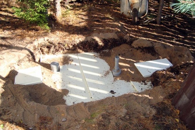 Une fosse septique exploitée dans des climats froids est isolée avec des feuilles de mousse. L'isolation est très utile pour éviter l'apparition de fissures dans les cubes de polyéthylène remplis de drains lors de fortes gelées. La fosse septique est recouverte de terre.