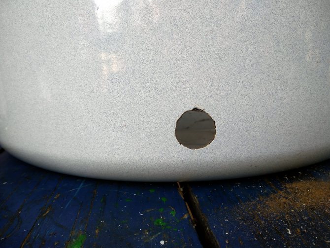 Nous avons percé des trous dans les parois verticales opposées de chaque eurocube pour de courtes longueurs (30 cm) de tuyaux d'égout, qui à l'intérieur se terminent par des tés. Si le deuxième cube a une capacité de 800 litres, un trou est fait dans le bord supérieur. Les trous pour les tuyaux d'entrée de chaque conteneur sont faits de sorte que la coupe supérieure du té soit sous le sommet du cube. Le trou pour le tuyau de sortie (de raccordement) est coupé de 20 à 30 cm plus bas, car le deuxième té est un trop-plein. Le polyéthylène peut être coupé avec une meuleuse à l'aide d'un cutter de 110 mm. Vous pouvez agir avec un disque et une scie à métaux à main le long du contour dessiné.
