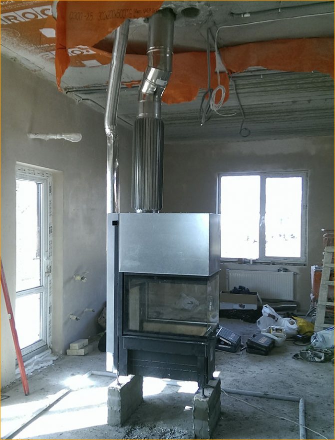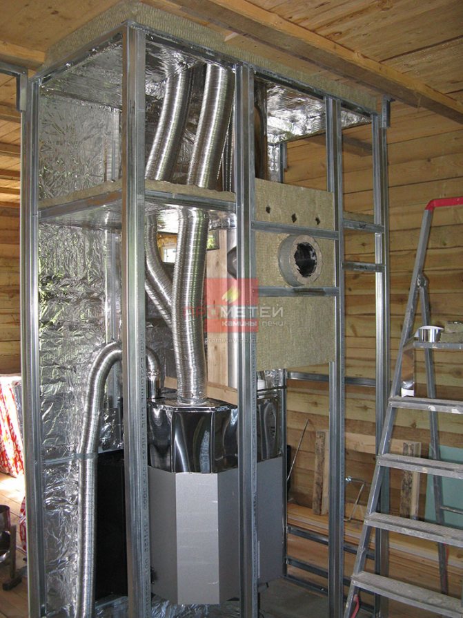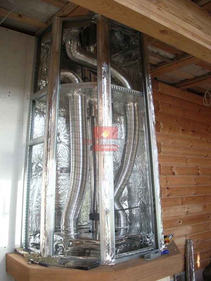 Un tuyau galvanisé en acier résistant à la chaleur peut être utilisé comme cheminée. Une telle cheminée est multicouche (en conséquence, une sorte de «sandwich» est obtenue), sur trois côtés, elle est fermée avec des plaques de plâtre.