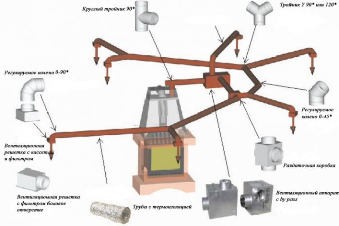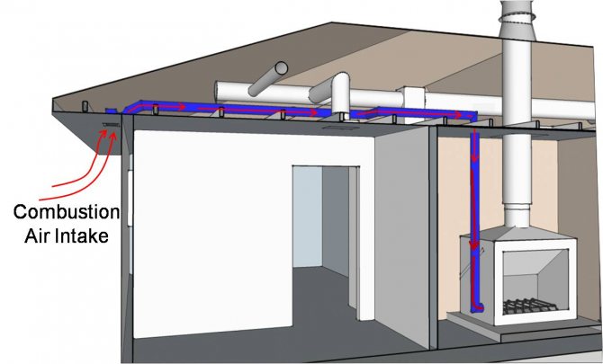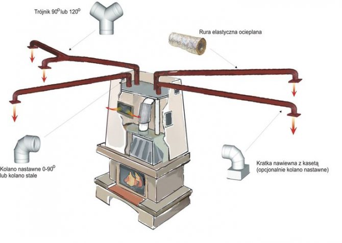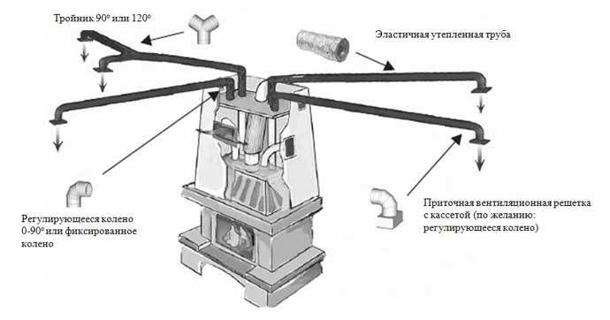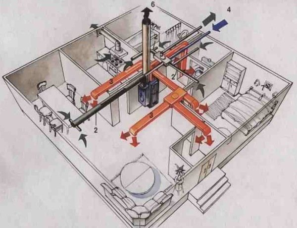 Le chauffage de l'air par cheminée d'une maison avec un grand nombre de pièces et une longueur de tuyau de plus de 3 mètres doit être effectué selon un schéma à circulation forcée.