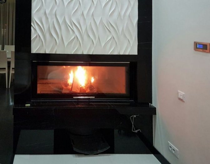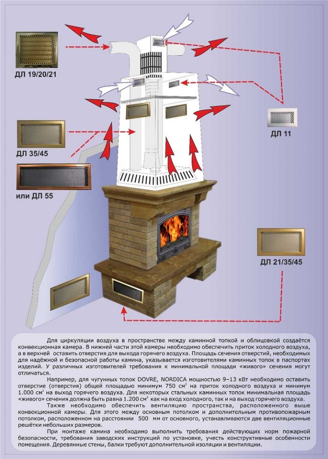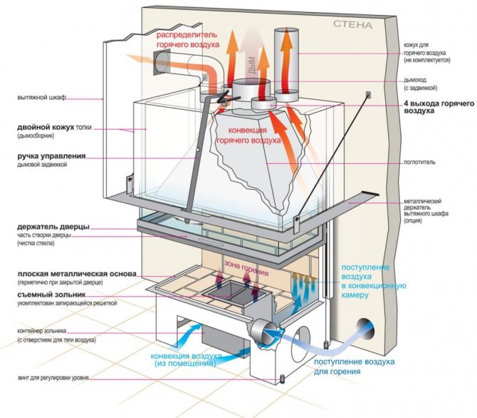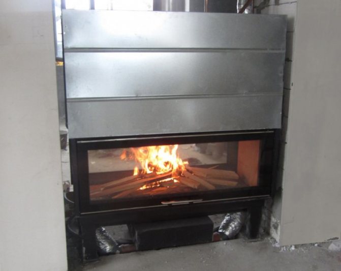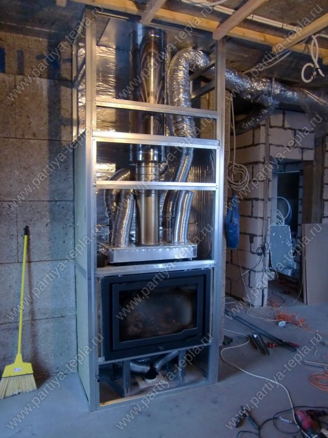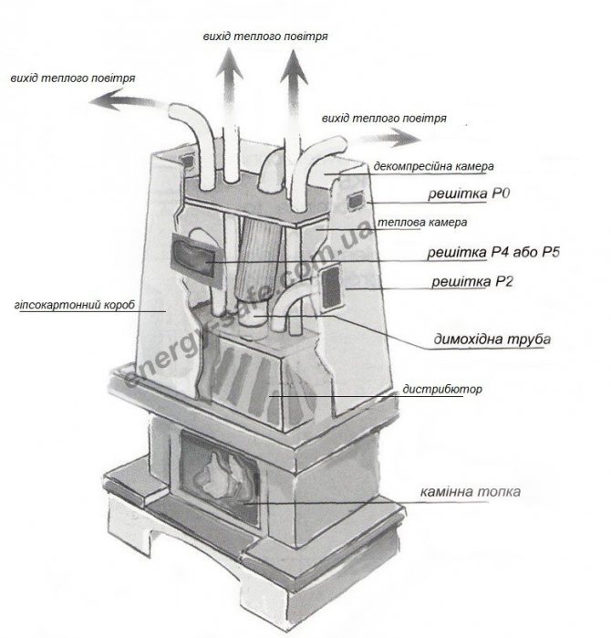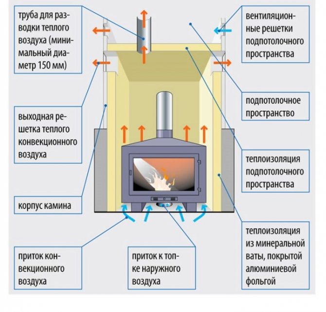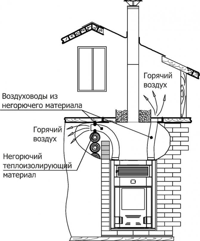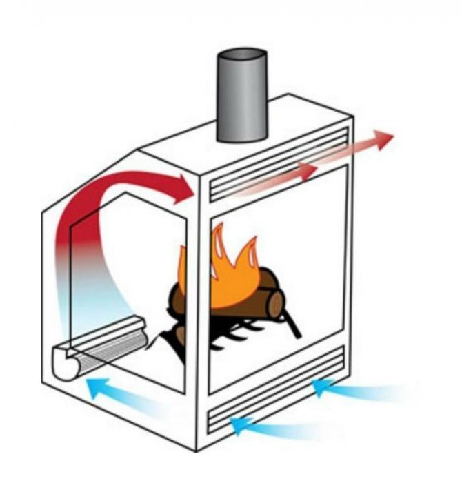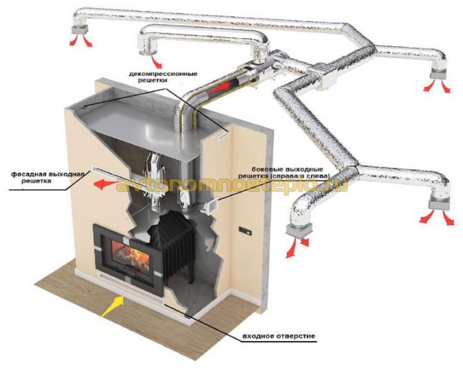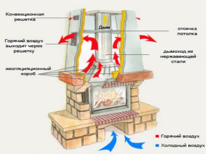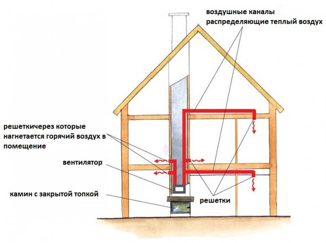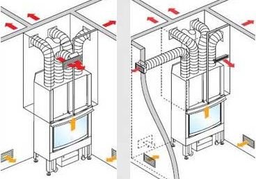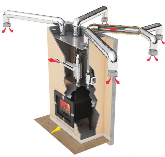 Dans ce cas, le foyer est conçu et construit de manière à ce qu'il y ait de la place pour la circulation de l'air entre la chambre de combustion en acier ou en fonte et la surface extérieure de l'appareil de chauffage. Ce dernier, lorsqu'il est chauffé, est distribué dans d'autres pièces de la maison au moyen de conduits d'air spécialement installés et interconnectés.