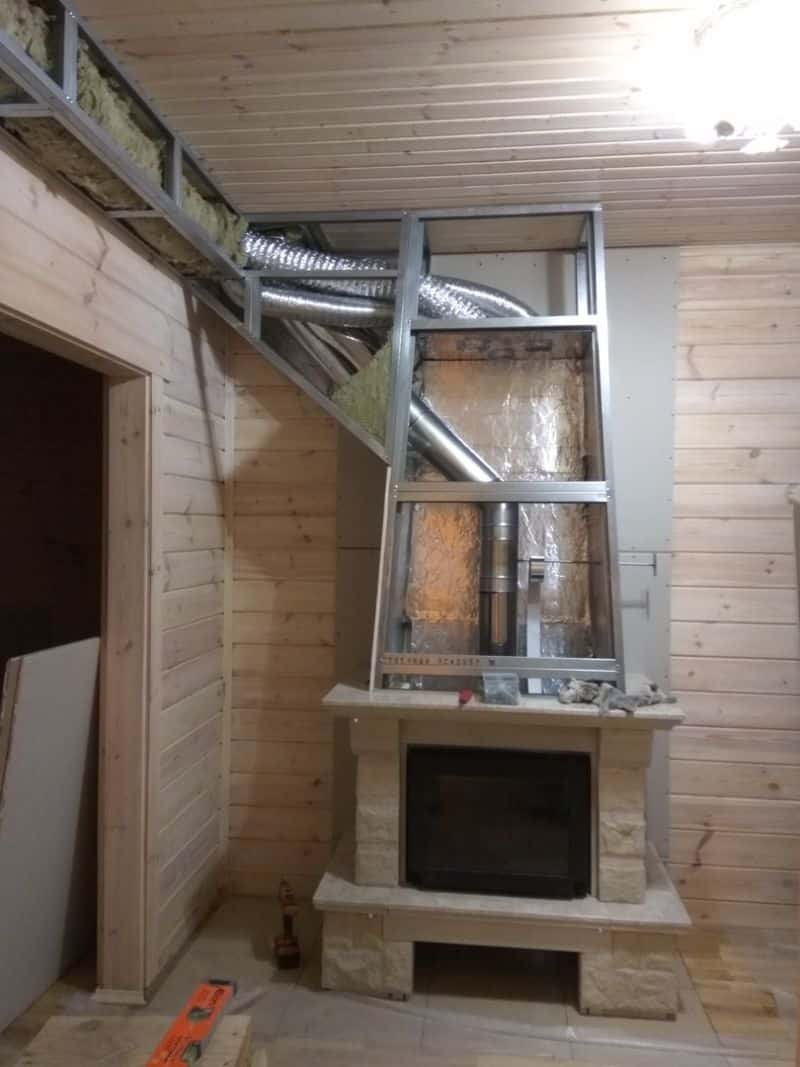 La même ligne est faite de briques lors de la construction d'une maison ou d'un tuyau métallique flexible. La tâche du maître est d'isoler thermiquement cette ligne afin que l'air retienne l'énergie le plus longtemps possible pendant le transport. Vous pouvez masquer le conduit à l'aide d'une boîte de cloison sèche. Pour cela, un cadre est constitué d'un profilé métallique et gainé de plaques de plâtre résistant à la chaleur. Dans certains cas, des conduits d'air sont réalisés à l'intérieur du mur.