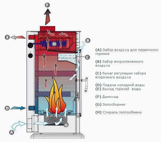 Le four d'une telle unité est constitué de deux couches, entre lesquelles circule un caloporteur liquide. Par la suite, de l'eau ou de l'antigel est acheminé par des canalisations vers les radiateurs de chauffage, où un échange de chaleur a lieu entre l'eau et l'air de la pièce.