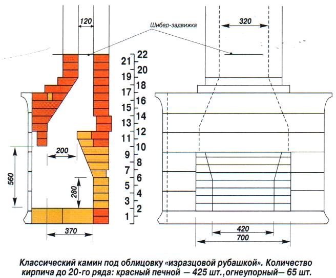 Une caractéristique de la maçonnerie de la cheminée illustrée sur le schéma est la mise en place d'un grand nombre de briques à la base sur le bord. Au-dessus, un long canal étroit est aménagé, où se déplace l'air chauffé de la pièce. Passons à l'algorithme de construction: