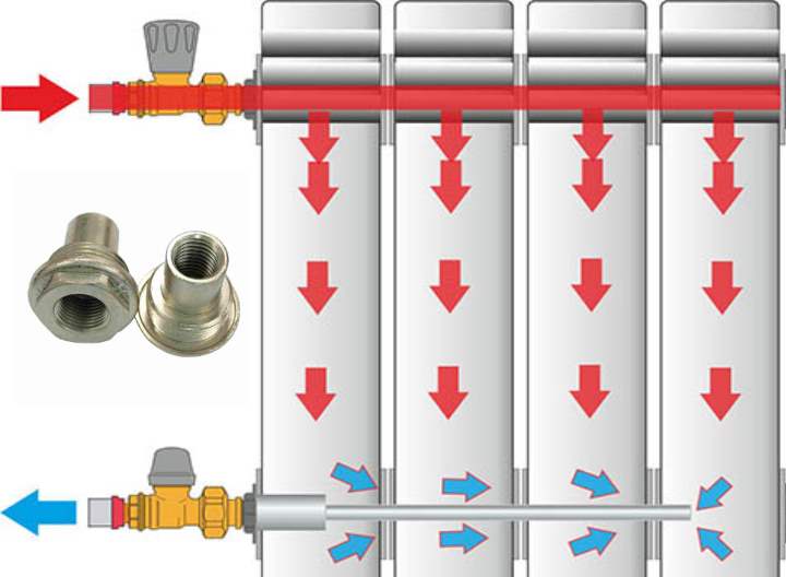 L'extension de débit est utilisée pour le radiateur bimétallique. Il est rarement utilisé pour les produits en fonte. Il est possible d'installer le dispositif pour batteries connecté au système de chauffage au moyen de robinets ordinaires avec un américain. Cela implique que des vannes d'arrêt doivent être installées sur les tuyaux de retour et d'alimentation.