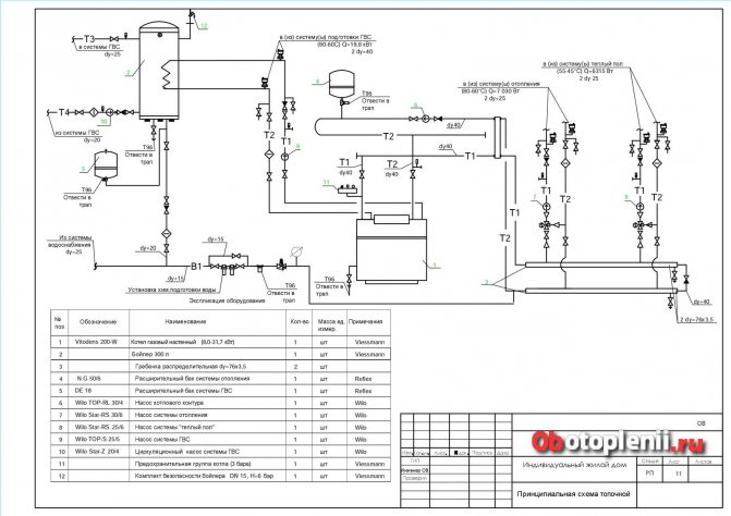 Ce schéma utilise une chaudière à gaz murale à deux circuits de Viesmann (1), d'une capacité de 8,0 à 31,7 kW. En plus du système de chauffage, le schéma prévoit un système d'alimentation en eau chaude (2) (une chaudière de la même entreprise pour 300 litres) et un système de chauffage avec des planchers chauffants.