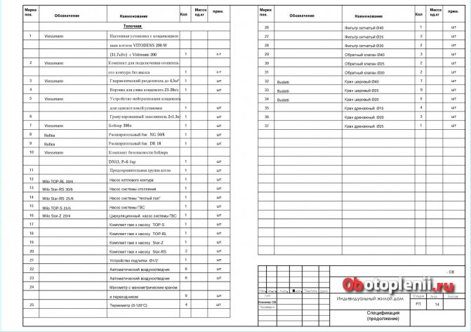 La partie ingénierie fait partie intégrante du projet de maison. Il comprend des dessins pour tous les équipements d'ingénierie et les réseaux d'ingénierie à l'intérieur et à l'extérieur de la maison. La partie chauffage du projet s'appelle Dessins d'atelier de chauffage et de ventilation. Un jeu de dessins OV se compose des feuilles suivantes (par exemple) :