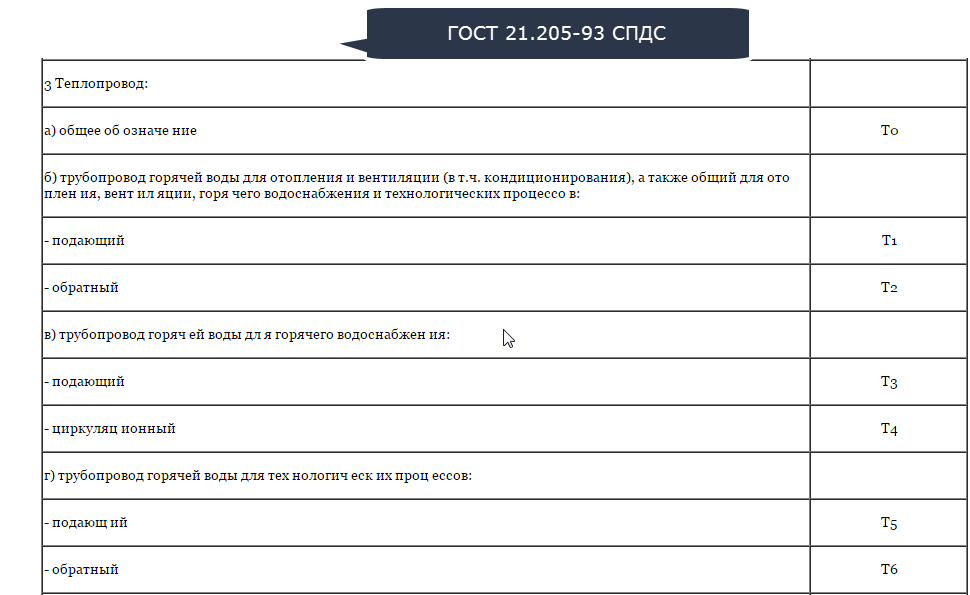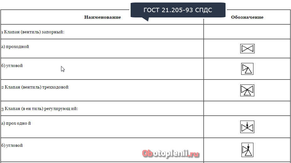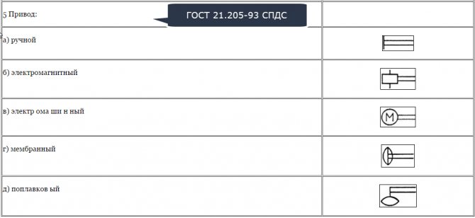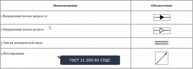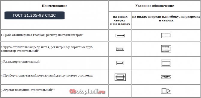 Les désignations sur les schémas normatifs sont effectuées par des conventions, conformément aux documents GOST. Pour le chauffage, il s'agit de GOST 21.609-83, GOST 21-606-95: Normes pour la mise en œuvre de dessins d'équipements thermiques à l'intérieur d'un bâtiment.