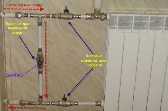 Afin de pouvoir réguler le fonctionnement des appareils individuels connectés à une colonne montante, des dérivations (sections de fermeture) sont connectées au réseau - il s'agit d'un cavalier sous la forme d'un morceau de tuyau connecté par des tuyaux directs et de retour du radiateur, avec robinets et vannes.