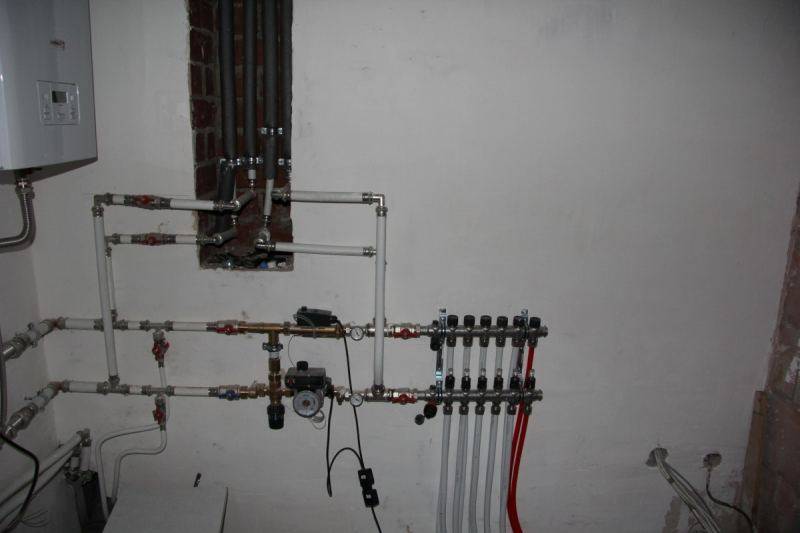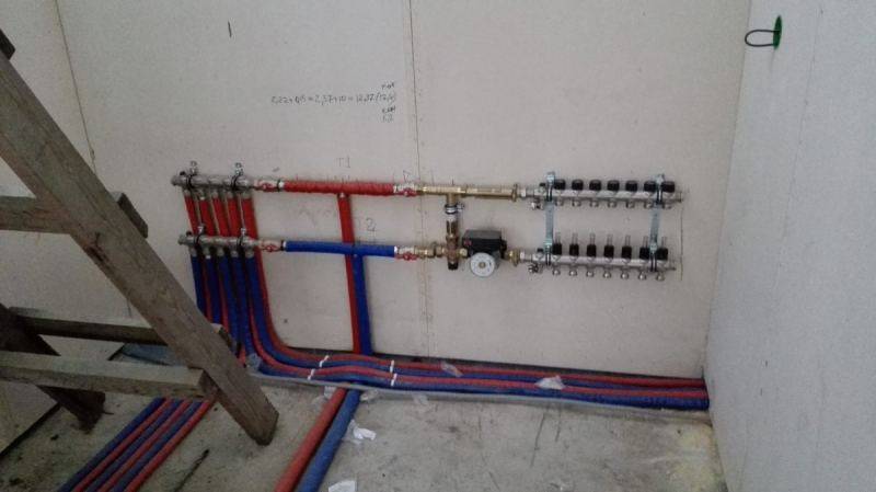 - Après avoir pris la décision de placer un câblage à deux tuyaux équipé d'un collecteur dans le bâtiment, réfléchissez soigneusement et planifiez l'emplacement du soi-disant peigne, qui sert d'unité de distribution de liquide de refroidissement. La longueur des tuyaux qui en sortent doit être proportionnée. Dans le cas contraire, une différence importante de leur longueur du peigne aux batteries peut entraîner une différence de pression importante.