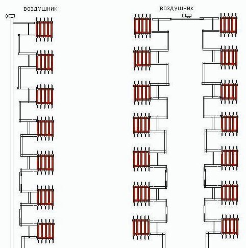 - verticale. Il est utilisé pour créer des systèmes de chauffage dans des bâtiments à plusieurs étages. Dans ce cas, les batteries sont reliées des étages supérieurs aux étages inférieurs au moyen d'une colonne montante verticale.