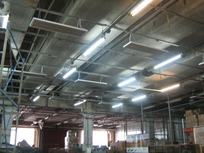 N'oubliez pas le système de chauffage au plafond, qui est souvent utilisé pour chauffer les bâtiments industriels. À l'aide d'appareils spéciaux, ce n'est pas l'air qui est chauffé, mais les murs, le plafond et le sol. Il n'y a pas de circulation, par conséquent, le risque d'attraper un rhume ou un mal de gorge pour les travailleurs d'un département ou d'un atelier est réduit. Un certain nombre d'avantages se distinguent dans le système de chauffage au plafond, tels que: longue durée de vie, prend peu de place, se distingue par sa simplicité et sa rapidité d'installation et a un faible poids.