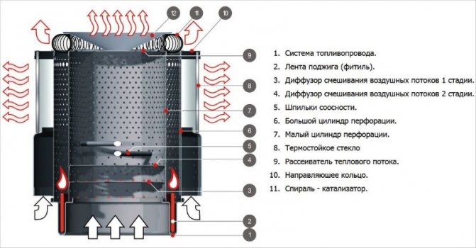 L'emplacement du réservoir au-dessus du niveau de la chambre de combustion est basé sur le principe de l'alimentation en gazole. Il s'écoule par gravité.Dans une chambre spéciale, le gazole est mélangé à de l'air et se réchauffe. Ainsi, un mélange combustible est formé. En outre, le mélange combustible pénètre dans la chambre de combustion. Dans celui-ci, lors de la combustion, la spirale se réchauffe. Cette bobine agit comme un élément chauffant. Avec un bon fonctionnement, il chauffe jusqu'à une température d'environ 800°C.