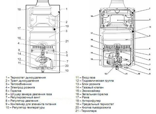 Les chauffe-eau à gaz à écoulement continu sont une structure métallique avec un système de chauffage. Des tuyaux y sont connectés pour l'entrée d'eau froide et la sortie d'eau chaude, pour le caloporteur circulant à travers l'échangeur de chaleur, ainsi que pour le gaz. L'allumeur est situé au bas de l'équipement. Il fonctionne comme un briquet.