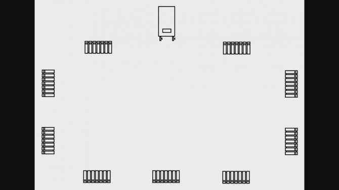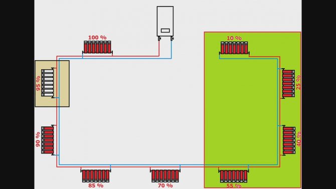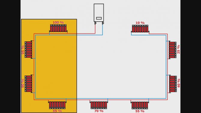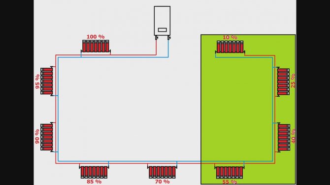 Il s'avère être huitième au service et deuxième au retour. Avec un tel schéma, il n'est plus nécessaire d'équilibrer les radiateurs eux-mêmes. Si tous les radiateurs et vannes sont complètement ouverts, tous les radiateurs démarreront toujours à 100% de leur capacité.