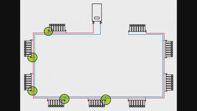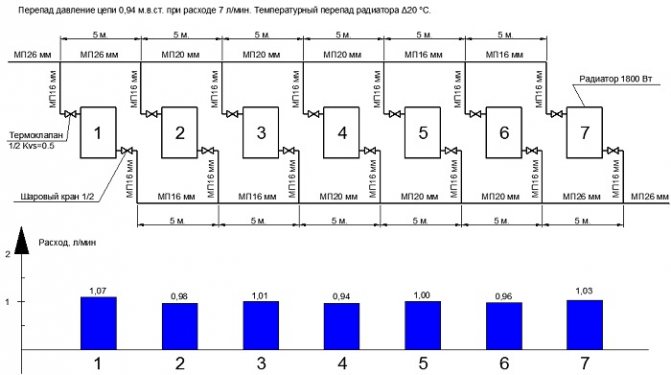 Bien sûr, il y a différentes maisons, la longueur des tuyaux et le nombre de sections. Par conséquent, le système peut fonctionner mieux ou moins bien, mais dans tous les cas, pour faire fonctionner tous les radiateurs, il est nécessaire de créer artificiellement une résistance pour le liquide de refroidissement dans les premiers radiateurs à l'aide de vannes d'équilibrage.