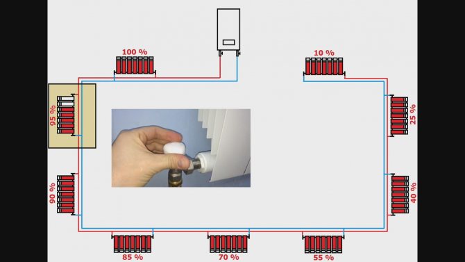 Après équilibrage, le premier radiateur chauffera de 100%, le second de 95%, le troisième de 90%, et ainsi de suite jusqu'au dernier radiateur. Dans le même temps, les derniers radiateurs ne démarreront jamais à plus de 60% de leur capacité.