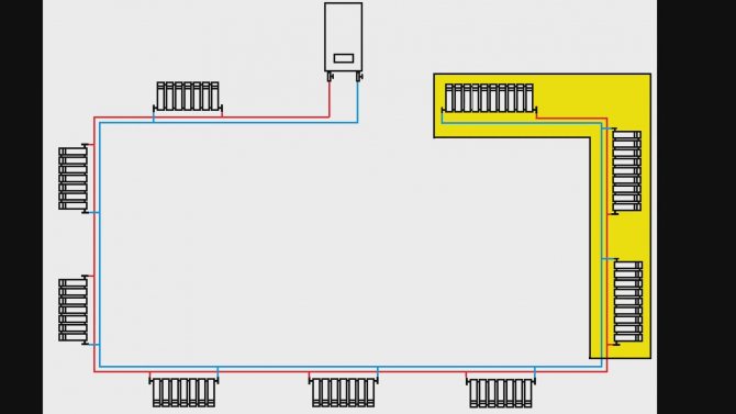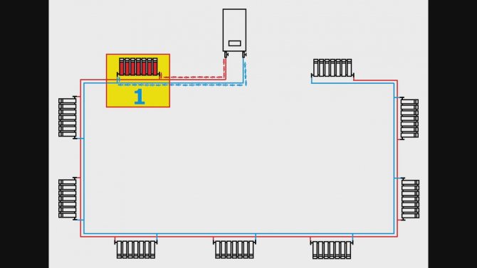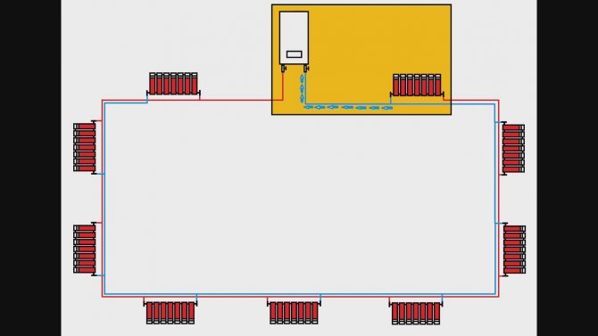 Depuis la chaudière, l'alimentation est connectée au collecteur à deux sorties, puis différentes branches sont connectées à différents radiateurs: