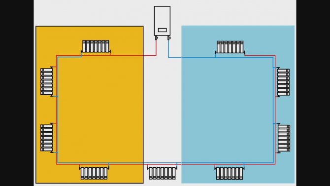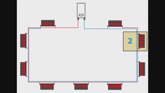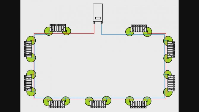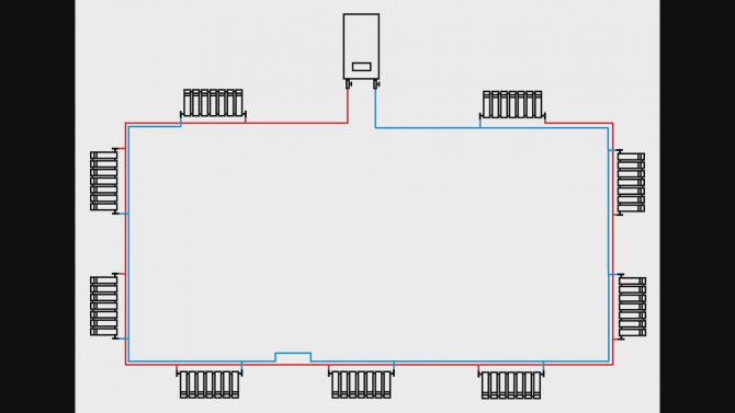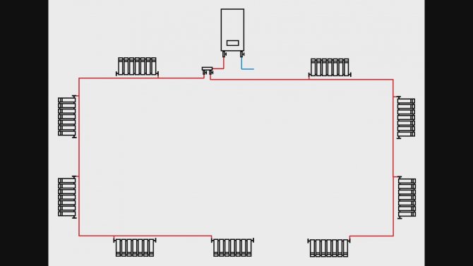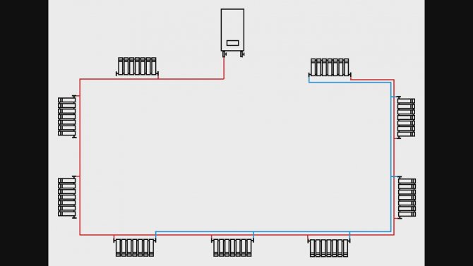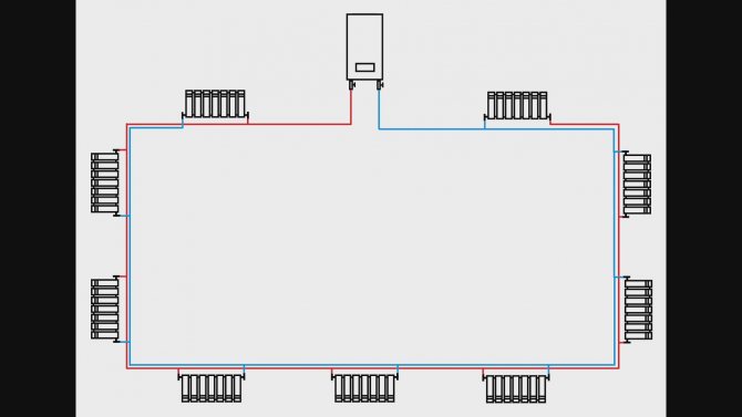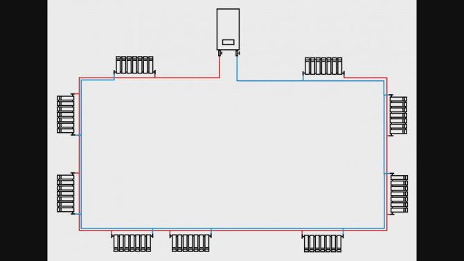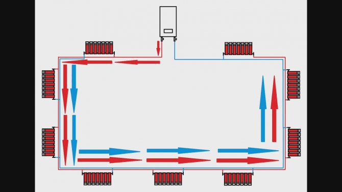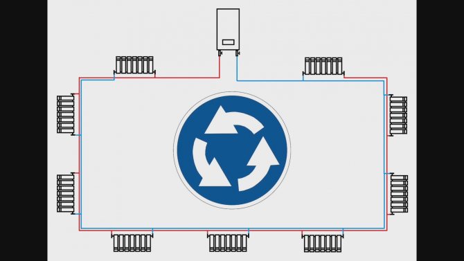 L'essence de l'idée consiste en la présence de la même longueur de sections droites et de tuyaux de retour reliant toutes les batteries de radiateur avec une chaudière et une pompe, ce qui crée les mêmes conditions hydrauliques dans tous les appareils de chauffage. Des boucles de circulation de longueur égale créent des conditions pour que le liquide de refroidissement chaud passe le même chemin vers le premier et le dernier radiateur avec la même énergie thermique reçue par eux.