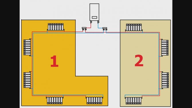 Il s'avère qu'il est possible d'utiliser un câblage à deux tuyaux avec un débit d'eau passant uniquement avec une longueur totale de la ligne de 70 mètres, sur laquelle il est installé à partir de 10 radiateurs. Dans le cas contraire, le câblage associé ne justifiera pas l'investissement.