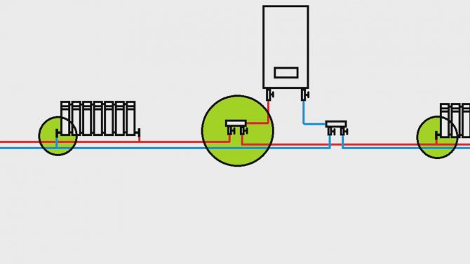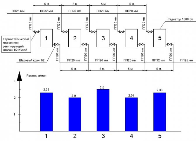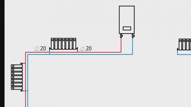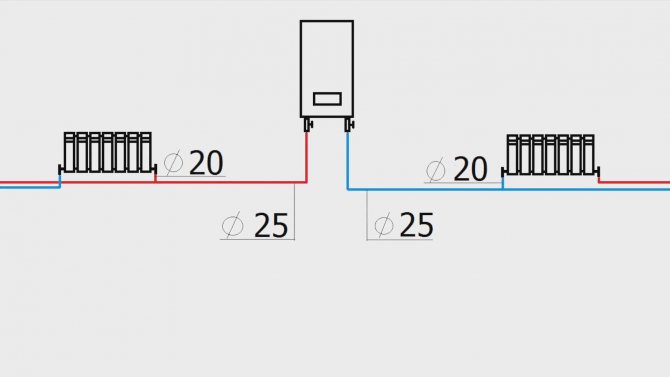 Habituellement, avec ce schéma, les tuyaux d'alimentation et de retour principaux ont un diamètre de 25 mm et les radiateurs sont connectés à des tuyaux d'un diamètre de 20 mm.
