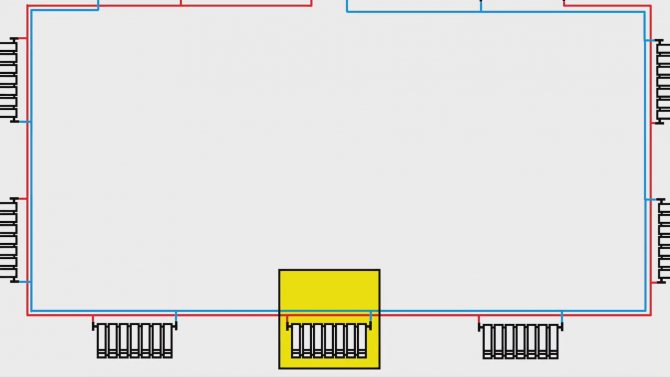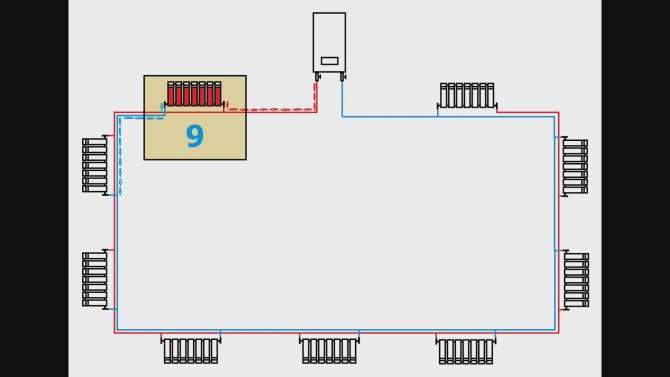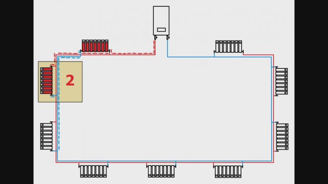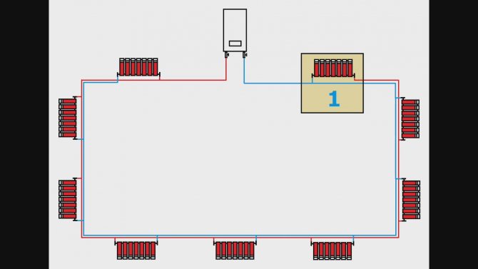 Des circuits d'alimentation et de retour plus courts sont obtenus, mais dans ce cas, l'équilibrage devra être effectué non seulement sur les radiateurs, mais également sur le collecteur des circuits de radiateurs, car en pratique il ne se produit pratiquement pas que les deux branches soient exactement les mêmes et ont la même résistance hydraulique.