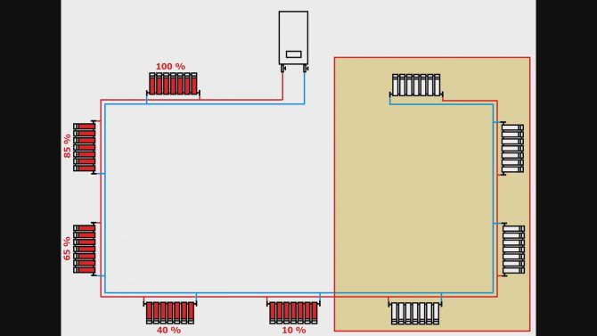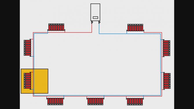 Imaginez un réseau de radiateurs déployé en ligne droite. Dans le schéma classique, l'unité de chauffage est située au début de cette rangée, à partir de celle-ci le long de l'ensemble du réseau, suivent deux tuyaux pour fournir respectivement du liquide de refroidissement chaud et du retour froid. Dans le même temps, chaque radiateur est une sorte de shunt, par conséquent, plus le réchauffeur est éloigné de l'unité de chauffage, plus la résistance hydraulique dans la boucle de sa connexion est élevée.