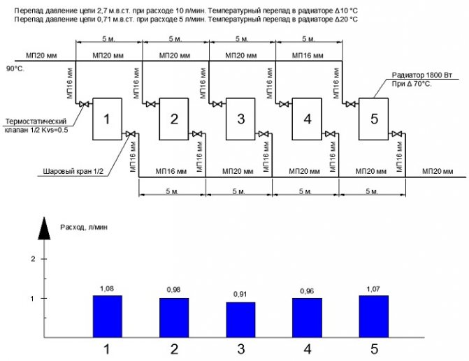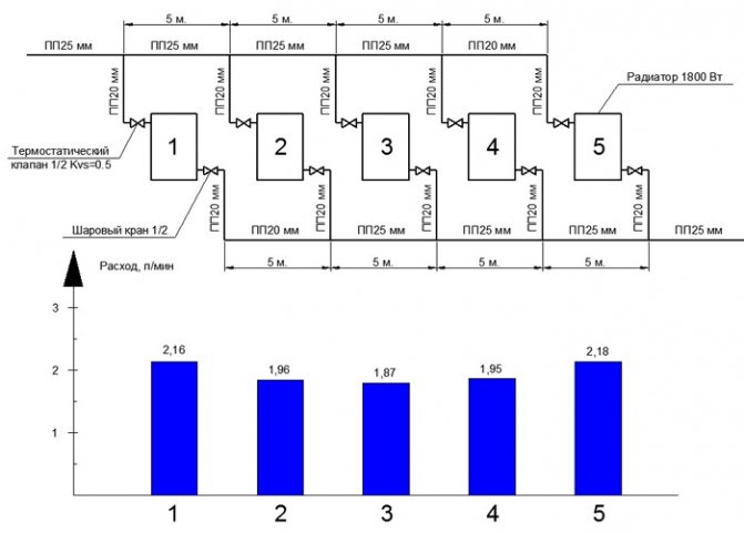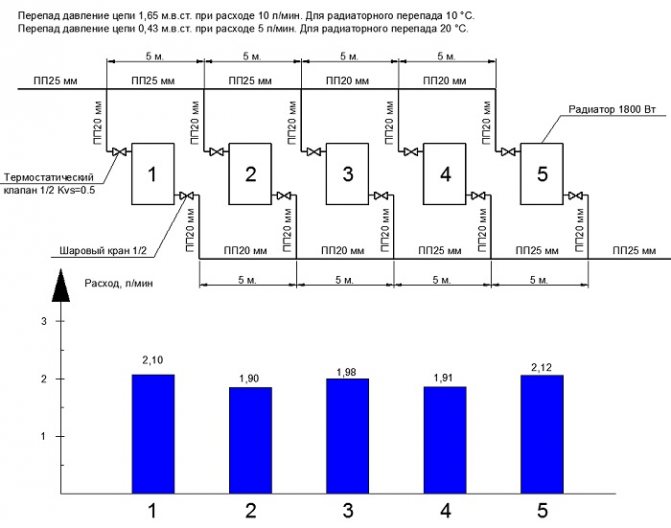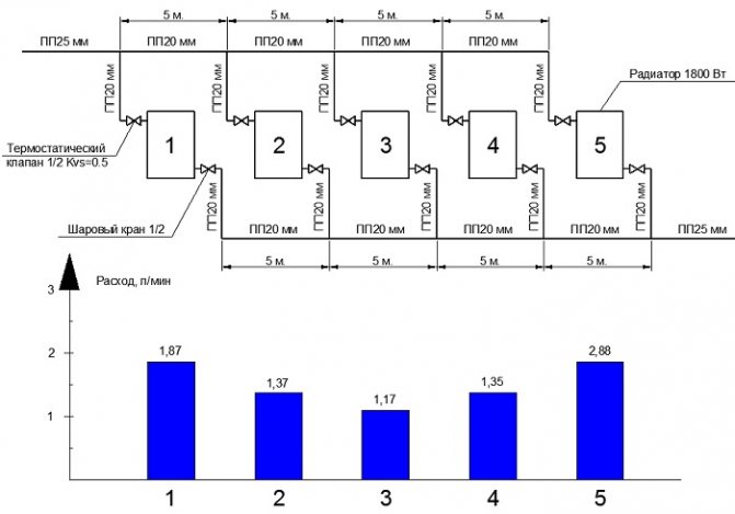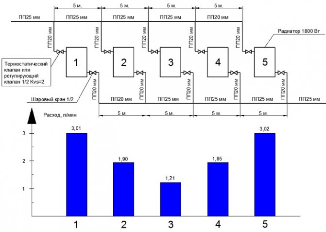 Chaque branche de radiateur doit avoir une résistance hydraulique égale à 0,5-1 Kvs. Cette résistance peut être donnée par une vanne thermostatique ou d'équilibrage, qui est placée sur la ligne du radiateur. En règle générale, lorsque des économies sont réalisées sur les vannes thermostatiques et d'équilibrage (c'est-à-dire qu'elles ne sont pas installées), chaque branche de radiateur commence à avoir une faible résistance hydraulique, ce qui est comparable à si vous connectez simplement l'alimentation et le retour avec un tuyau. (A peu près fait un contournement).