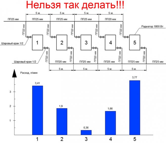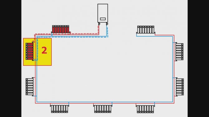Les derniers radiateurs fonctionneront le moins bien. Ce schéma présente un autre inconvénient. Par exemple, dans cette pièce, vous décidez de couper le courant du radiateur ou de le fermer complètement.