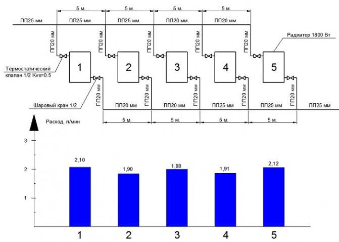 Une chaîne pour 5 radiateurs avec un tuyau principal en PP de 25 mm a été testée.