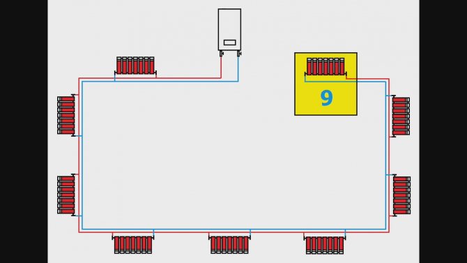 Ainsi, ce radiateur est le premier dans le débit et le neuvième dans le retour, c'est-à-dire qu'il a le débit le plus fort et le retour le plus faible. Ensuite, le liquide de refroidissement chauffe le radiateur suivant, qui est le deuxième dans le flux et le huitième dans le retour.