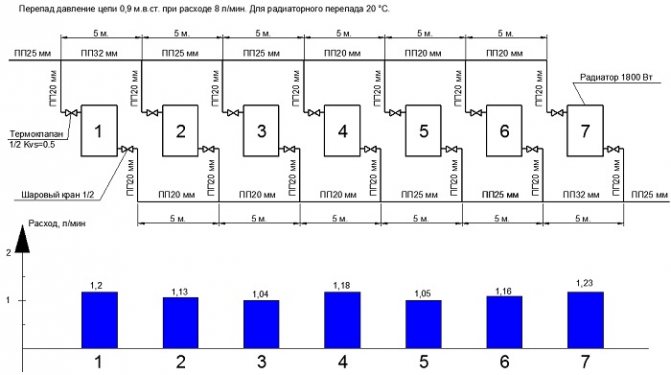 Cette chaîne utilise PP32 mm. Si vous placez la vanne d'équilibrage sur les radiateurs 1 et 7, vous pouvez changer le tuyau de PP32 à PP26 mm. Il est nécessaire de serrer les vannes d'équilibrage sur les radiateurs 1 et 7.